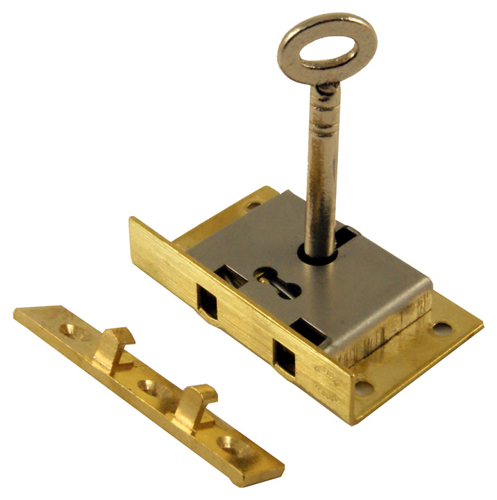 Fits in the front of a box with a hinged lid. Lock engages with a linkplate fitted to the lid.